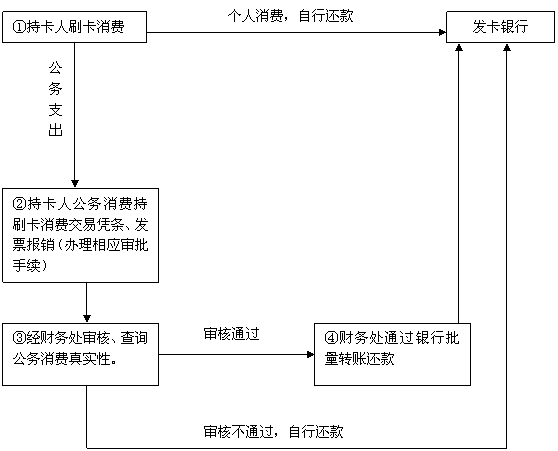 第三步:学校财务处根据交易凭证的“交易日期”、“卡号”和“消费金额”,通过国库集中支付系统提取相应的公务消费信息,按规定进行审核后,对符合个人公务卡结算范围的支出予以报销。对不予报销的部分,由职工自行偿还。